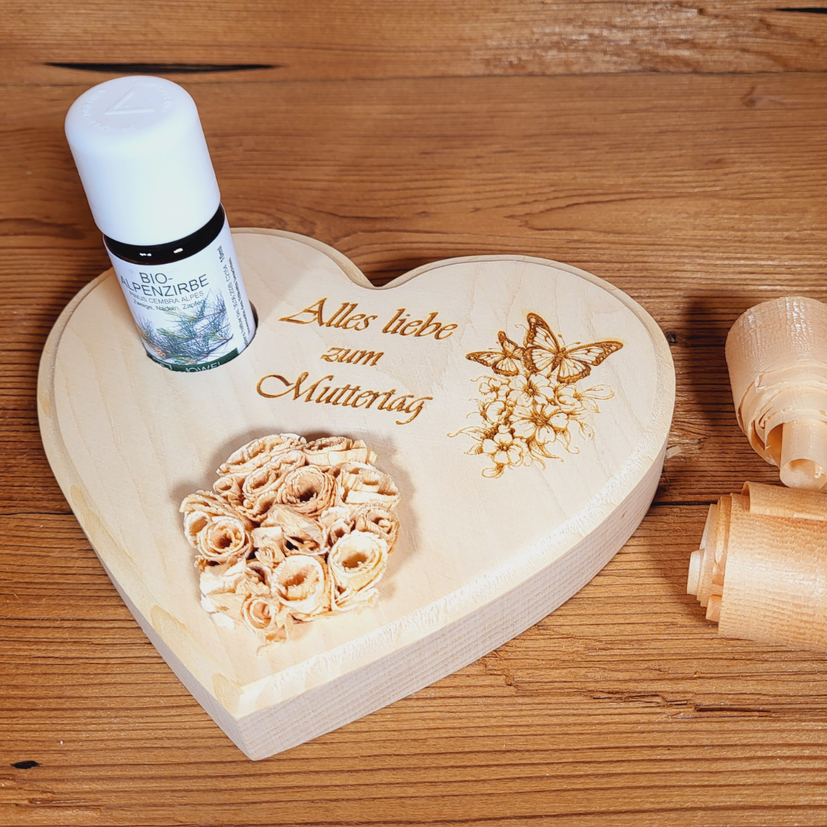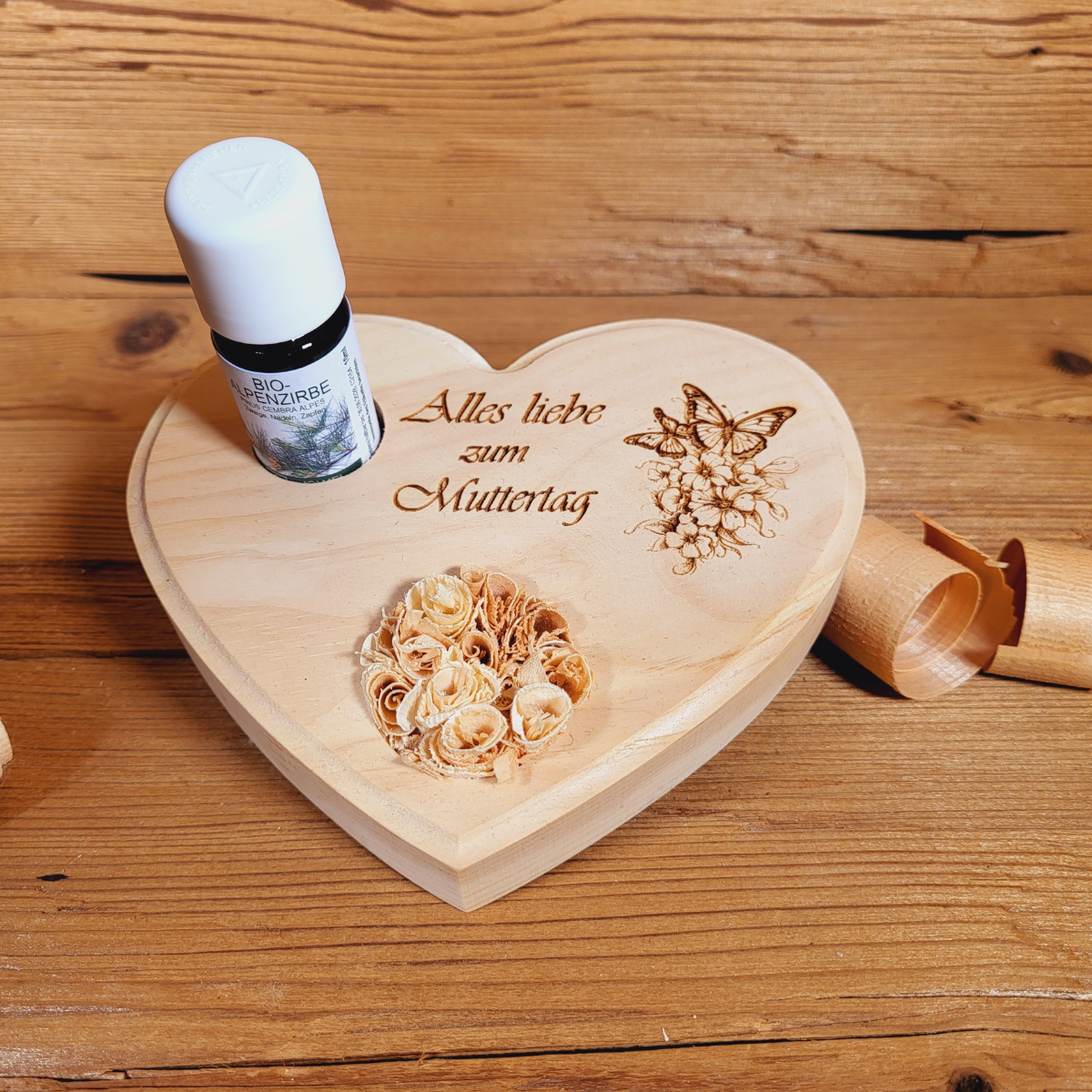 Verwöhnen Sie Ihre Mutter zum Muttertag mit unserem einzigartigen Zirbenherz, inkl. 10ml wohlduftendem Zirbenöl. Das perfekte Geschenk für eine entspannende Auszeit und eine natürliche Aromatherapie. Zeigen Sie Ihre Liebe und Wertschätzung mit diesem einzigartigen Geschenk.