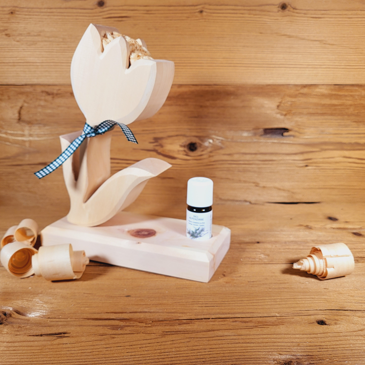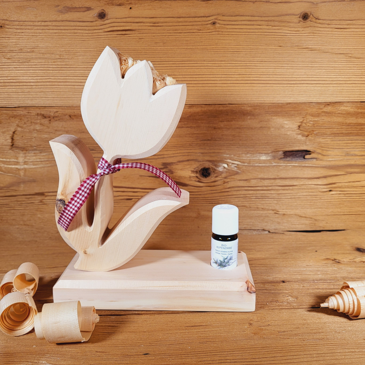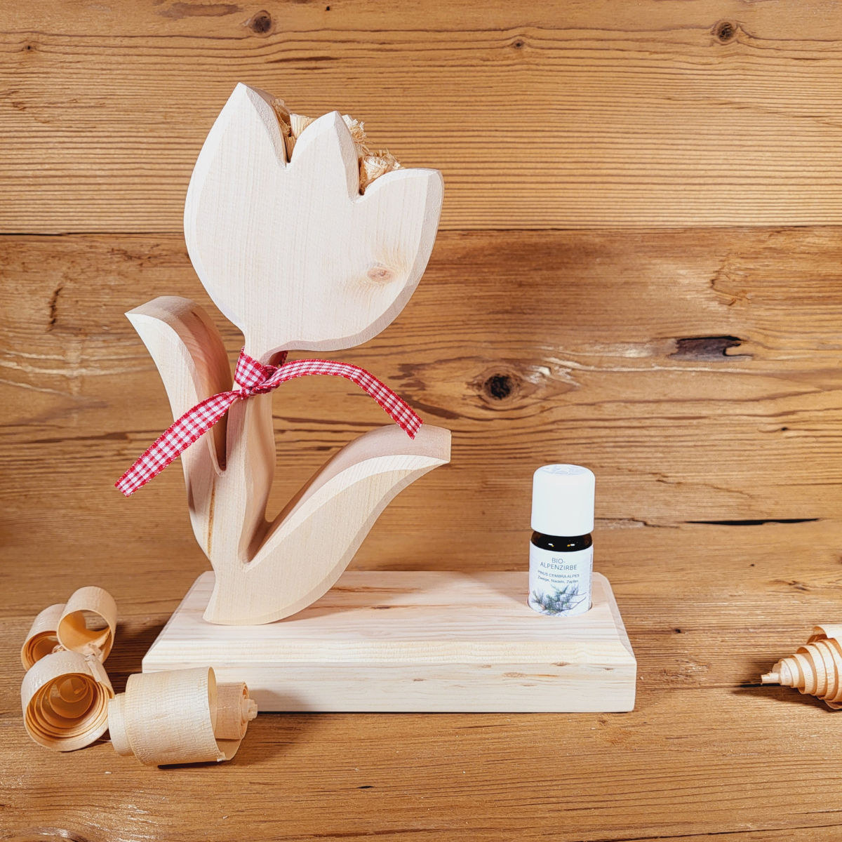 Aufwendig von Hand gefertigte Blume, gefüllt mit Zirbenlocken inkl. 10ml 100% ätherischen Zirbenöl.