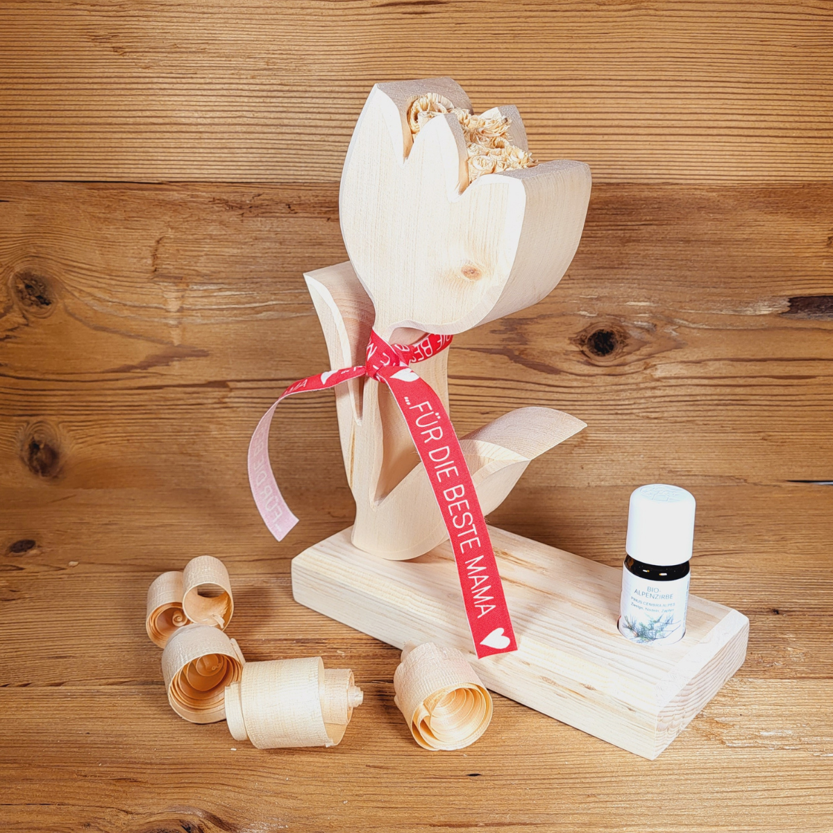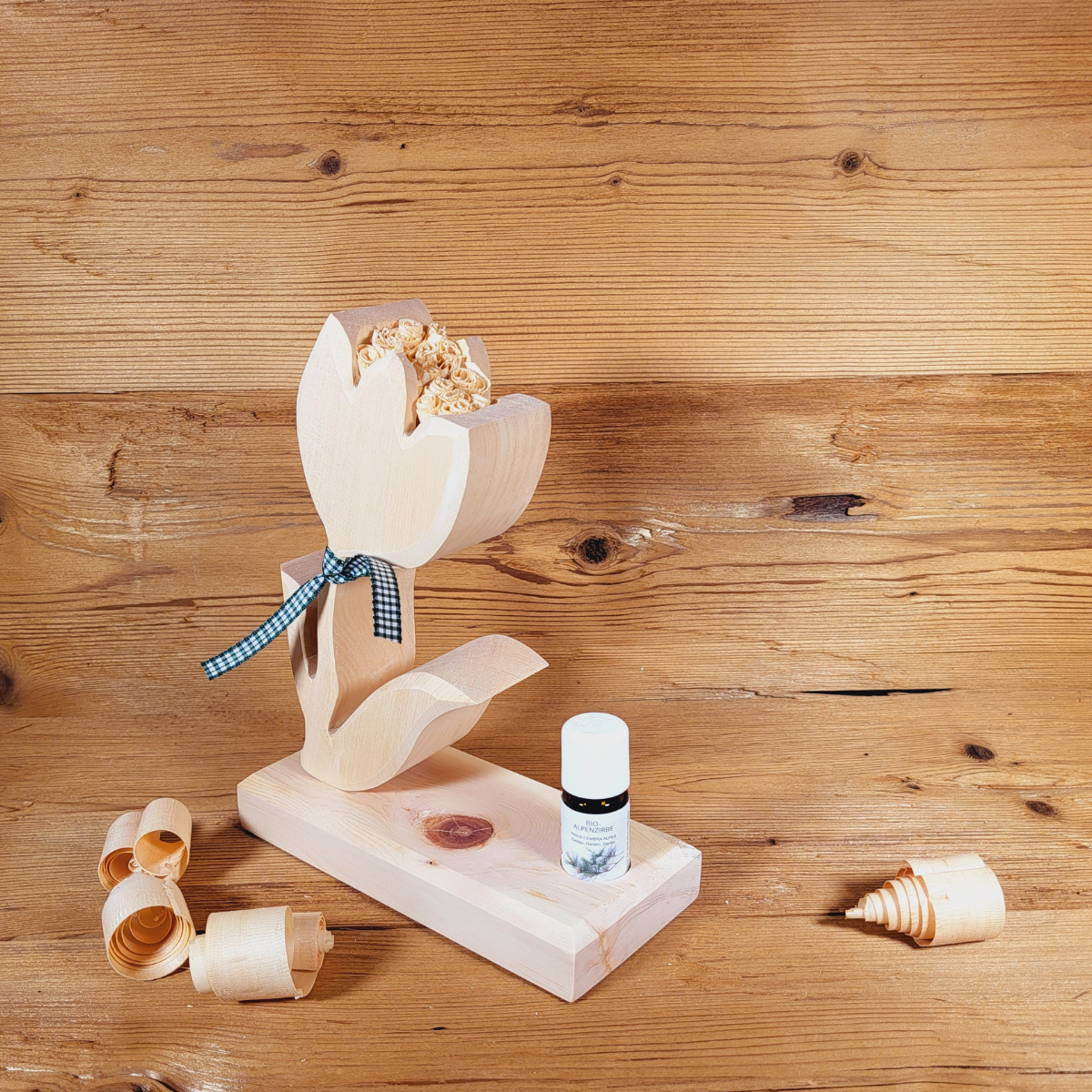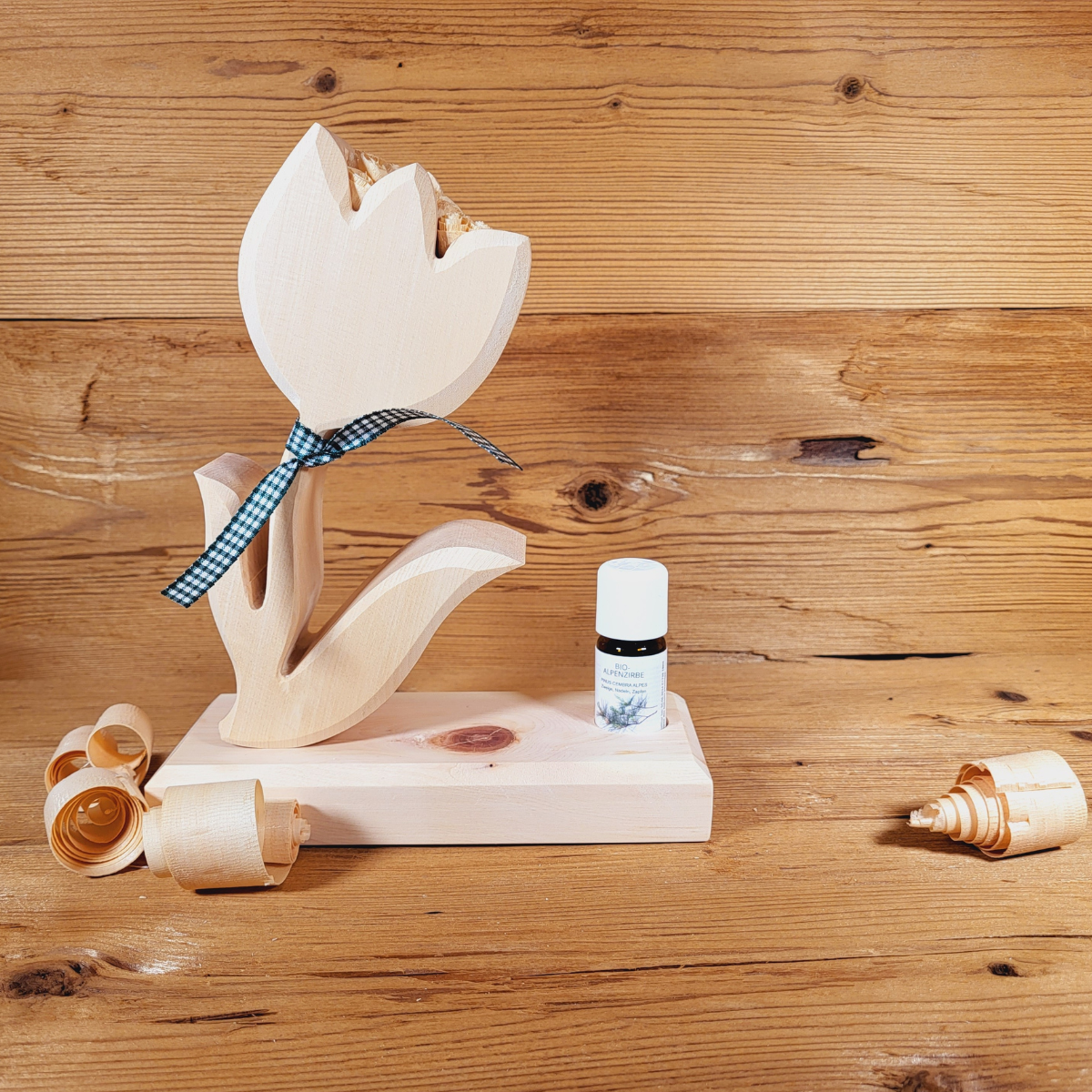 Aufwendig von Hand gefertigte Blume, gefüllt mit Zirbenlocken inkl. 10ml 100% ätherischen Zirbenöl.