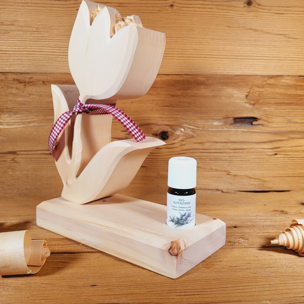 Die Zirbenblüte einfach mit wenigen Tropfen Zirbenöl beträufeln und einfach den Duft der Zirbe genießen.